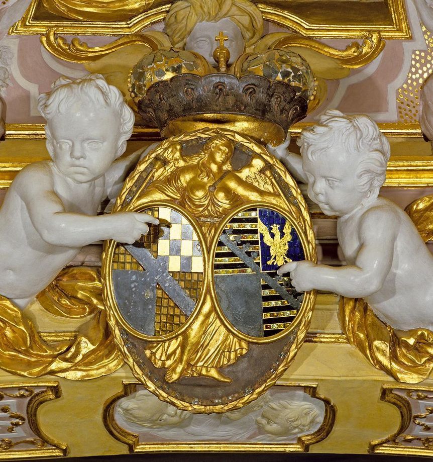 Allianzwappen von Baden und Sachsen-Lauenburg am Alkoven im Schlafzimmer der Markgräfin in Schloss Favorite Rastatt